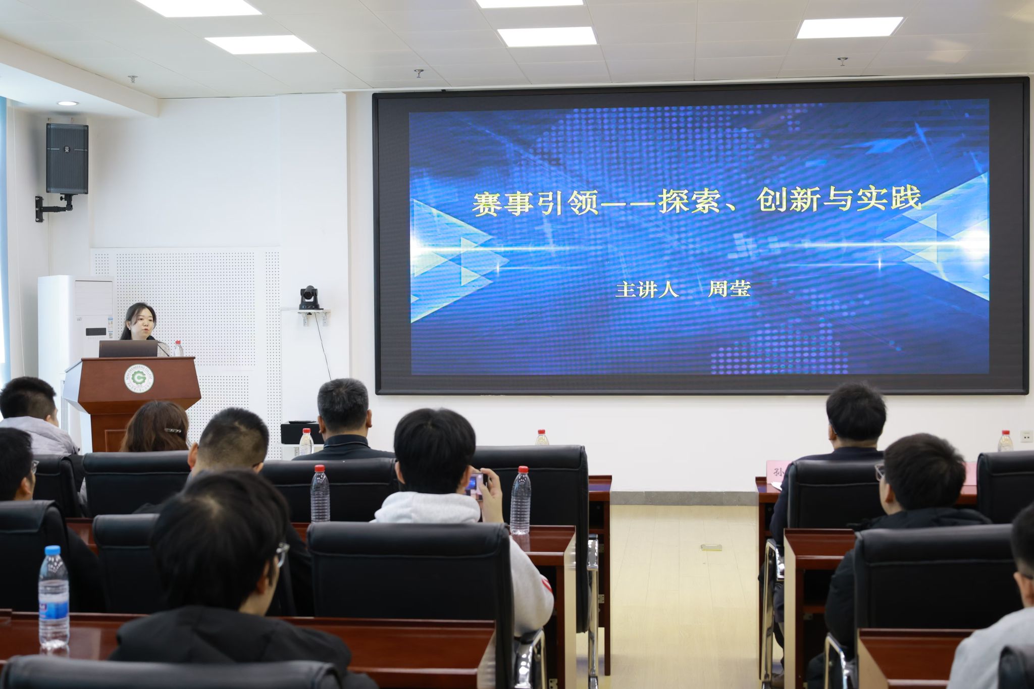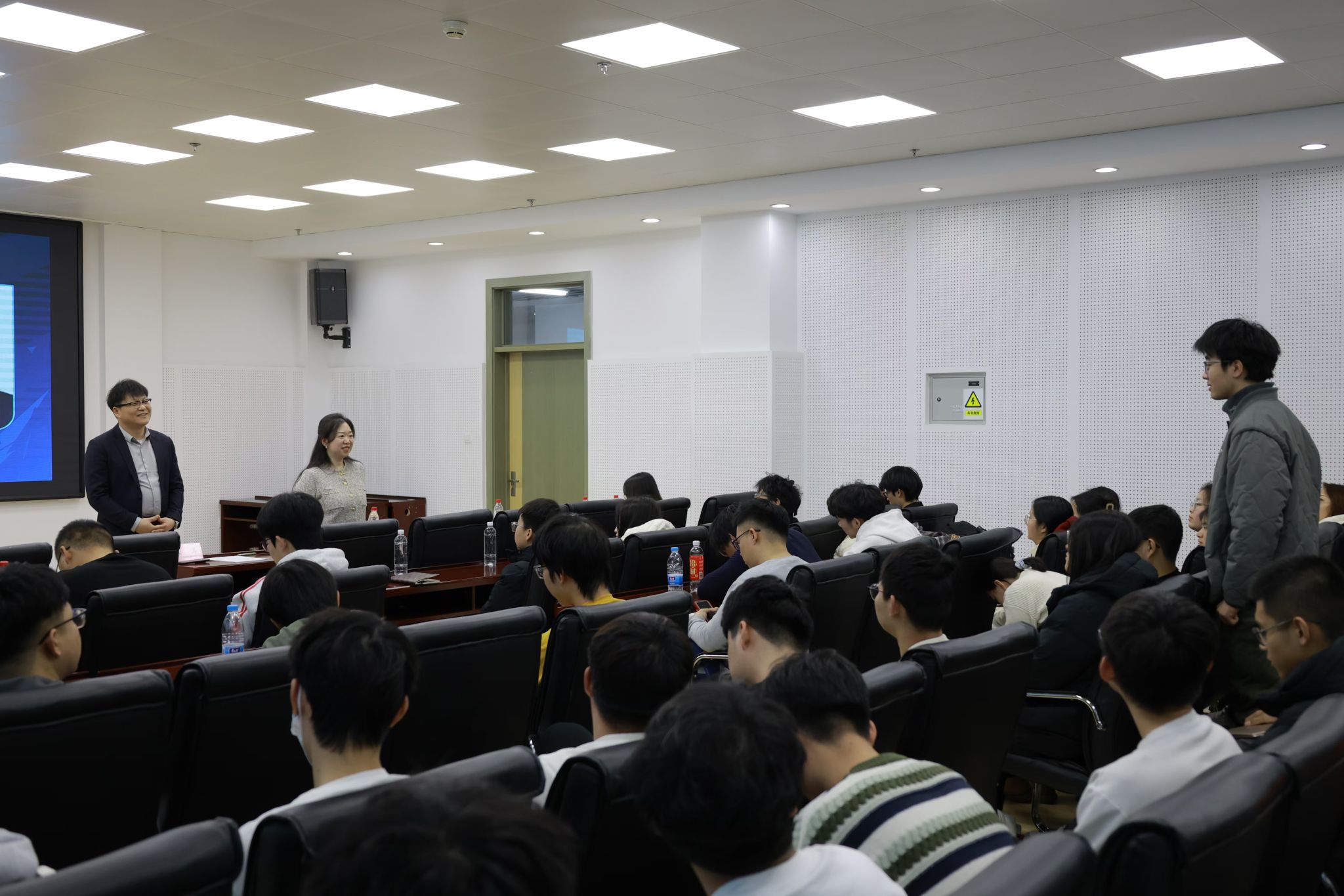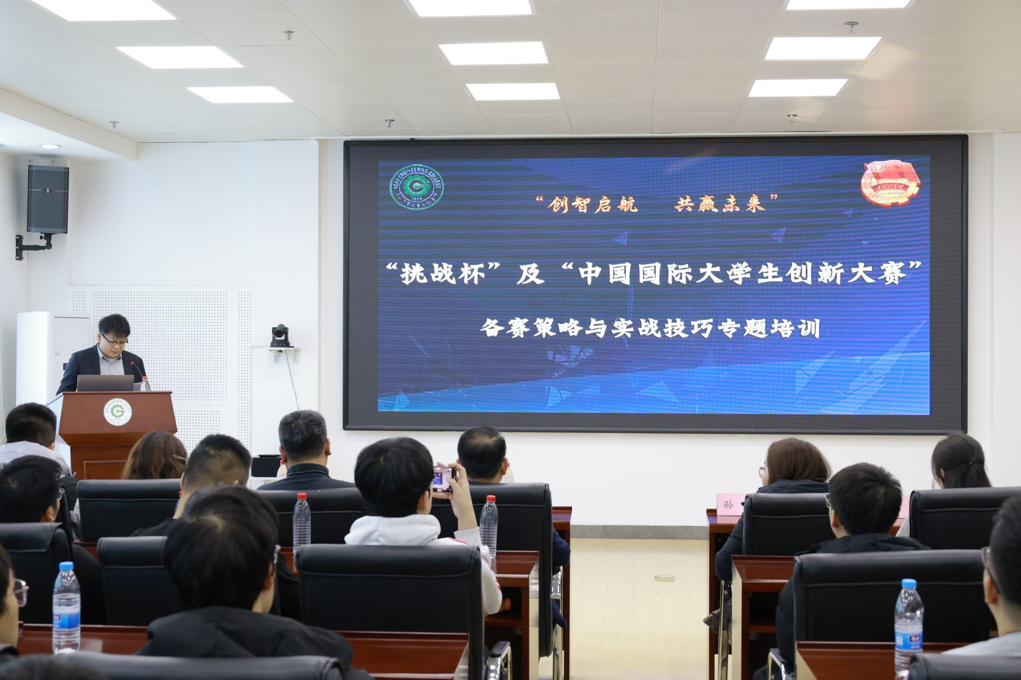 随后,周莹和张立栋两位专家分别从赛事分析、材料准备、项目优化、团队协作、路演技巧、案例分享、成果展示等多个维度,为在座师生提供了全面而深入的指导。周莹结合“挑战杯”及“中国国际大学生创新大赛”的发展历程、比赛形式、评审规则及关注点,详细阐述了项目呈现的关键要点,帮助学生准确把握赛事要求。张立栋结合自身丰富的指导经验,通过具体案例的深入剖析,分享了项目优化、团队协作及路演技巧等方面的宝贵经验。两位专家的讲解内容丰富且深入浅出,赢得了现场师生的阵阵掌声。