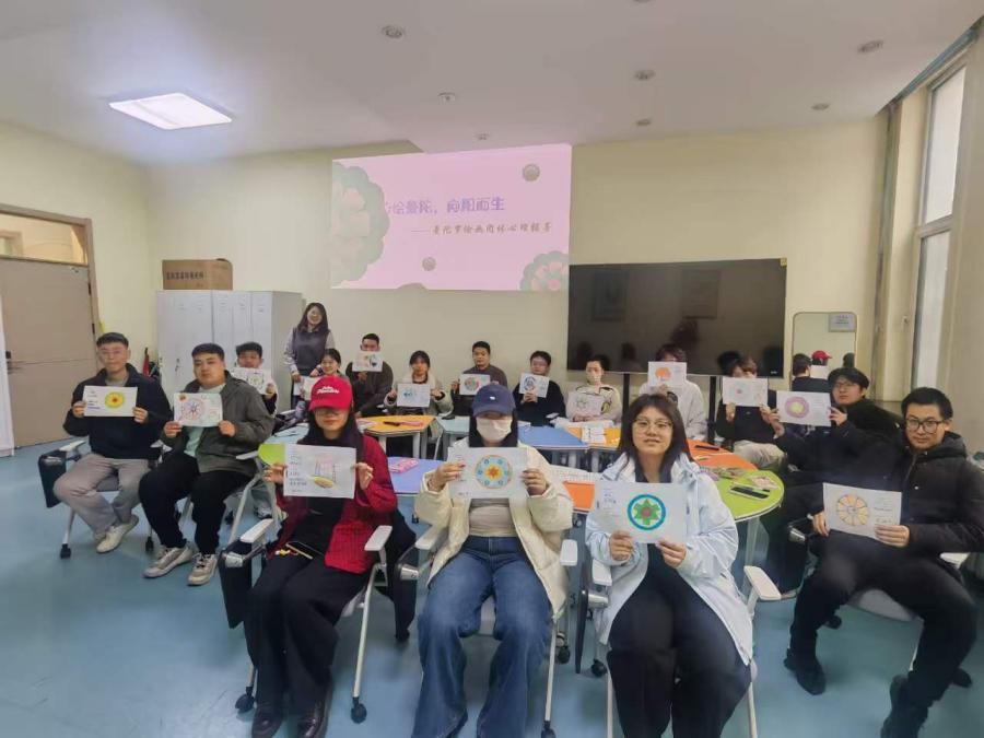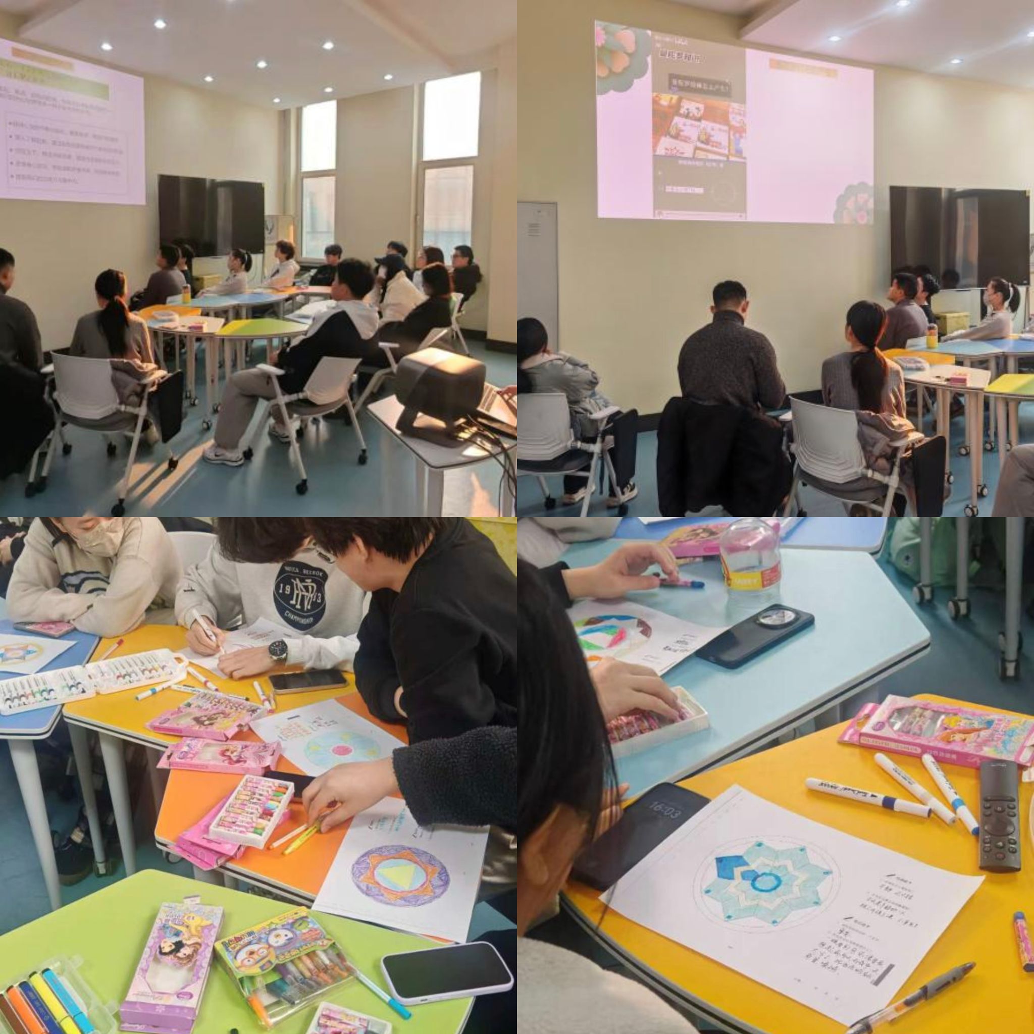 在实践体验环节,同学们在老师的引导下,按照“静—思—画—写—悟”的流程开展曼陀罗创作。活动现场氛围安静专注,同学们通过色彩、线条和图形表达内心感受,在创作过程中逐步放松身心、沉淀情绪、觉察自我。完成绘画后,同学们为作品命名,并记录创作感悟。在交流分享环节,大家围绕作品内容、创作感受和内心体验进行了真诚交流,在倾听与表达中进一步增进了对自我的理解和接纳。活动最后,同学们集中展示了各自作品,现场气氛温馨融洽。
