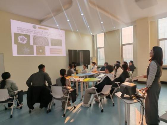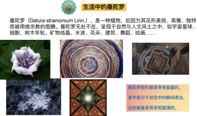 活动中,姚雪老师以“生活中的曼陀罗”为主题展开讲解,通过展示宇宙星球、细胞结构、树木年轮、花朵形态以及建筑图案等自然与人文现象中的曼陀罗图形,带领同学们感受曼陀罗所蕴含的秩序之美与和谐意蕴。通过生动讲解,同学们进一步认识到,曼陀罗并非遥远抽象的符号,而是广泛存在于日常生活之中,体现着独特的生命表达与审美价值。