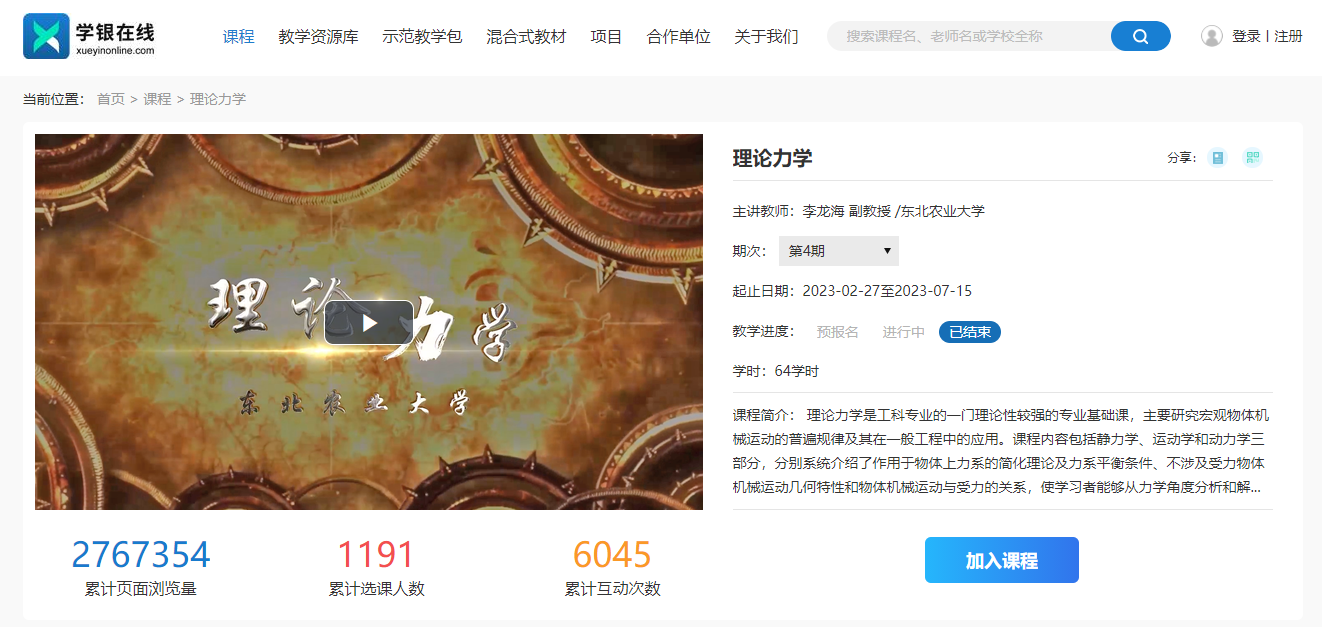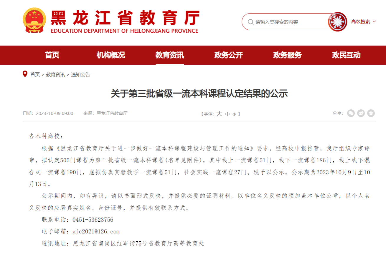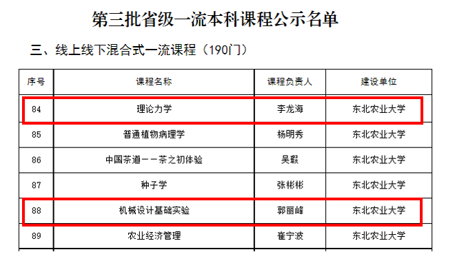 近日,黑龙江省教育厅公示了第三批省级一流本科课程认定结果,共计505门课程,十大信誉官网共有27门课程被认定为省级一流课程,其中十大信誉官网教师李龙海副教授主讲的《理论力学》、郭丽峰高级工程师主讲的《机械设计基础实验》获批线上线下混合式一流课程。截至目前,十大信誉官网共有国家级一流本科课程2门,省级一流本科课程4门,校级一流课程11门。