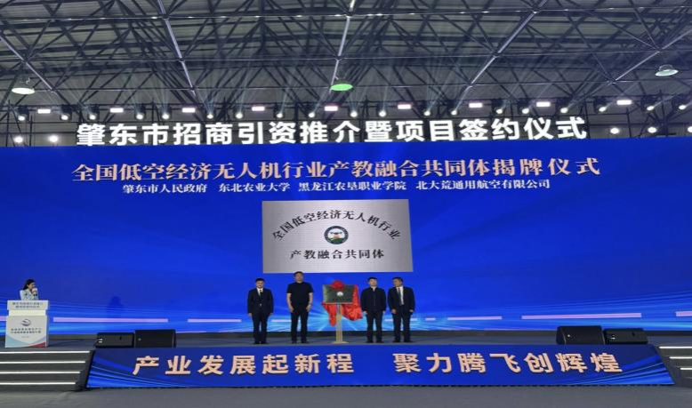 在签约仪式上举行了“全国低空经济无人机行业产教融合共同体”的揭牌仪式。肇东市副市长刘闯、黑龙江农垦职业学院校长刘玉峰、北大荒通用航空公司党委书记刘国驰与孙世钧副校长一同登台参加揭牌。