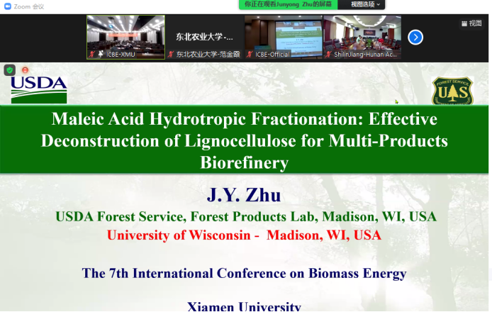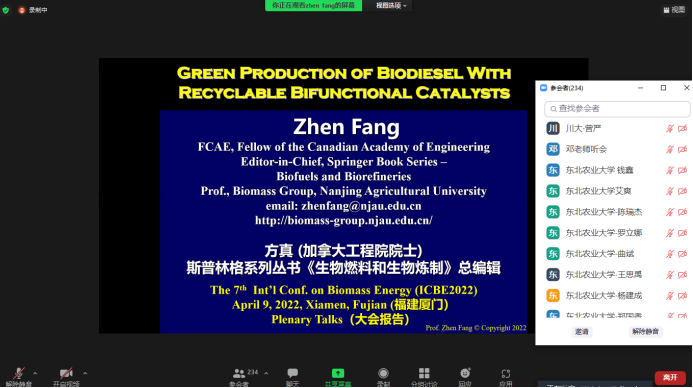 为促进生物质能源领域人才学术交流,培养专业兴趣,激发创新热情,推动生物质能源产业健康发展,4月8-9日,澳门十大信誉好的网站农业废弃物高值化利用学科团队教师和同学们线上参加了由中国可再生能源学会生物质能专业委员会、生物质能源产业技术创新战略联盟和厦门大学共同主办的第七届生物质能源国际会议暨第十五届全国研究生生物质能研讨会。会上听取了国内外领域权威专家谭天伟(院士)、陈勇(院士)、Zhu Junyong(USA)、Zheng Ying(Canada)、Zhen Fang(Canada)、Rafael Luque(Spain)、廖强、李昌珠的主旨报告以及青年科学家颜蓓蓓、曾宪海的精彩报告分享。