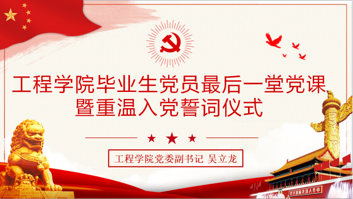 吴立龙书记以“新时代合格党员一定要不忘初心、牢记使命”为题带领大家重温入党的相关知识与规定、重温共产党员的权利与义务、重温党的纪律。他希望各位毕业生党员牢记党的教诲和嘱托,进一步坚定理想信念,在实践中绽放生命之花。同时站好毕业前最后一班岗,按时转接党组织关系、做好本人党员材料归档,遵守学校各项规章制度和毕业生离校各项规定,勉励毕业生党员在今后的工作、生活中继续勇挑重担,谱写属于工程人的壮丽篇章!