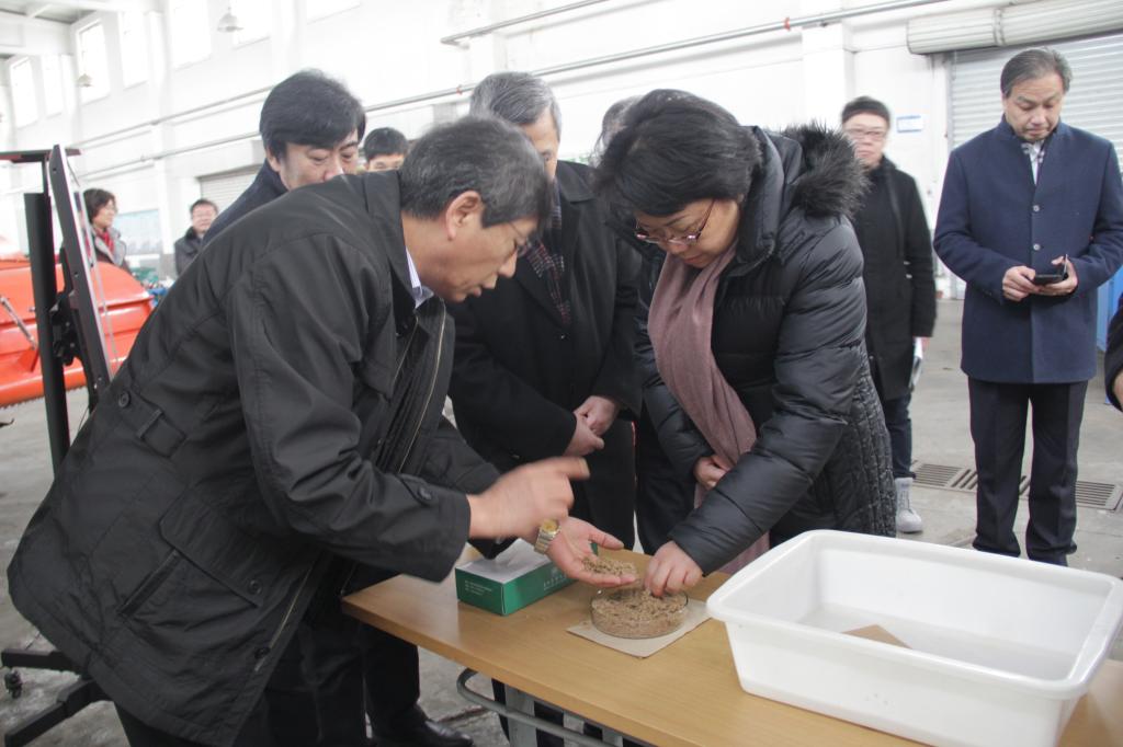 调研组到达农牧机械实验室后,院长陈海涛亲自上前迎接并为其详细讲解农产品技术。陈院长首先为调研组播放了割前脱粒联合收获机的介绍视频,随后就此设备与翁副部长进行了深入探讨。翁副部长对水稻的种植设备技术性能方面提出疑问,陈院长为他详细讲解了水稻插秧机的技术特点,并探讨了水稻的合理插秧对其收获的影响。