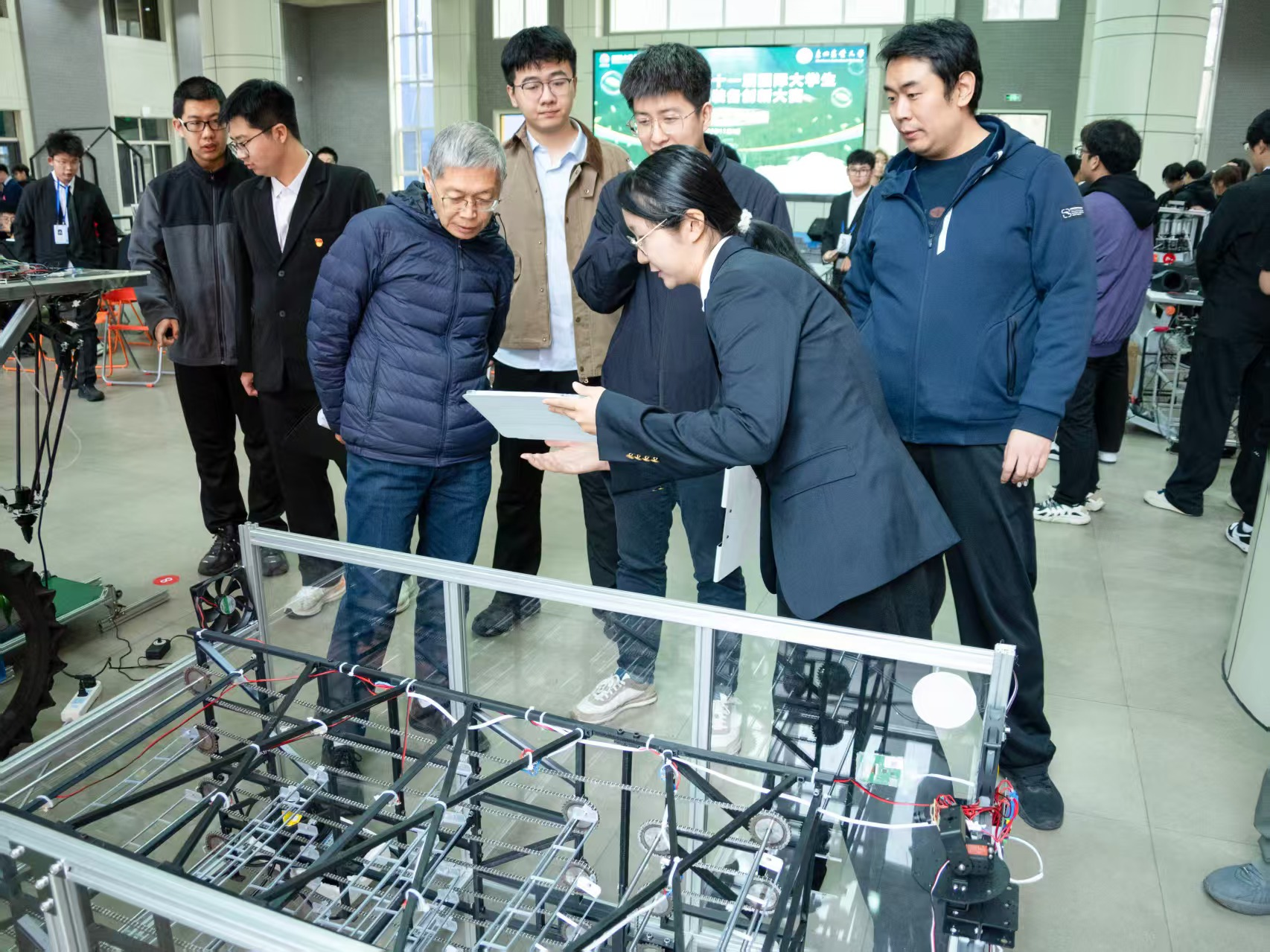 经前期申报与盲评,共25支团队入围终审答辩,其中A类科技发明制作项目23项,D类概念设计项目2项。比赛分为两个环节:项目展示汇报环节,团队进行3分钟PPT演示并接受2分钟问辩;项目路演环节,评委对样机或模型进行现场查验,综合评估实操性能与产业化潜力。整场赛事组织严谨、流程规范,展现了学生扎实的专业基础与创新能力。