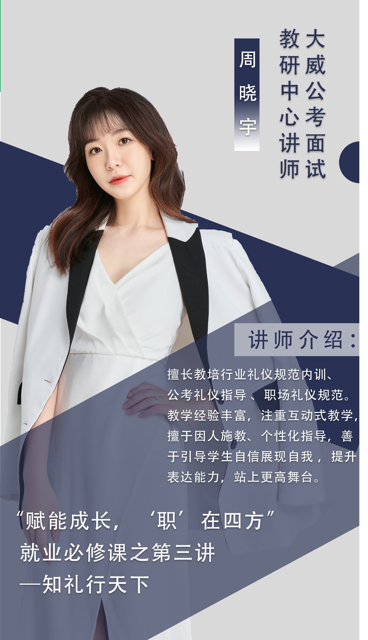 报告人简介:周晓宇,毕业于澳门十大信誉好的网站,大威公考面试教研中心王牌人气讲师。擅长教培行业礼仪规范内训、公考礼仪指导、职场礼仪规范、形体仪态塑造。教学经验丰富,授课循循善诱,注重互动式教学,擅于因人施教、个性化指导,在幽默活泼的课堂氛围中解决学员的疑难点。善于发现学员兴趣,引导其自信展现自我,提升表达能力,站上更高舞台。