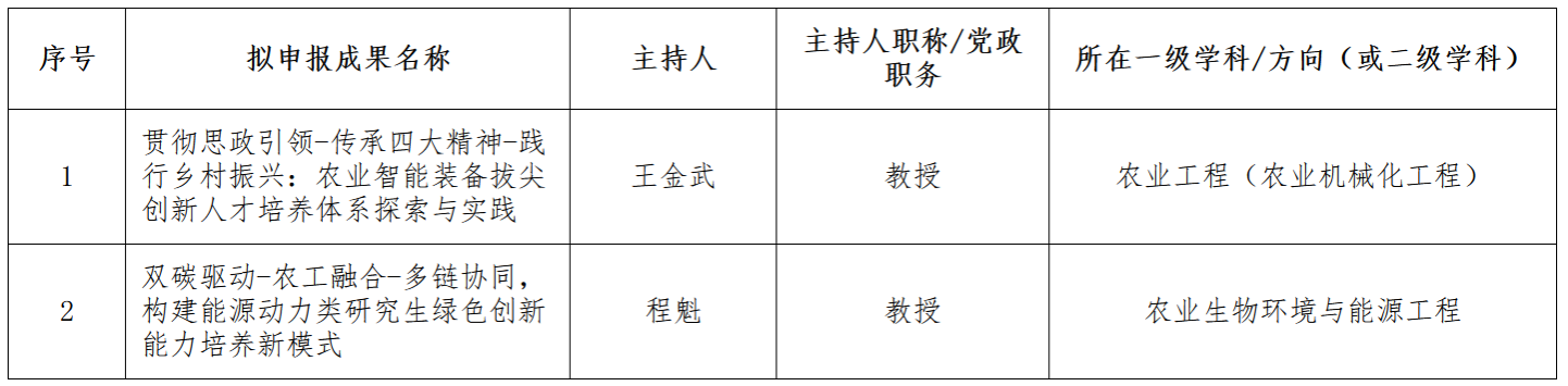 学校为进一步深化研究生教育教学改革,全面总结近年来十大信誉官网研究生教育教学建设取得的经验和成果,推动十大信誉官网研究生教育高质量发展,学校决定开展2025年校级研究生教学成果奖评选工作,结合学校关于申报名额及限制条件等相关规定https://graduate.neau.edu.cn/info/1149/4152.htm,十大信誉官网积极组织相关申报工作。经教师个人申报、学院组织专家评审等环节,拟推荐以下项目参与2025年度澳门十大信誉好的网站研究生教学成果奖申报,现将推荐项目予以公示: