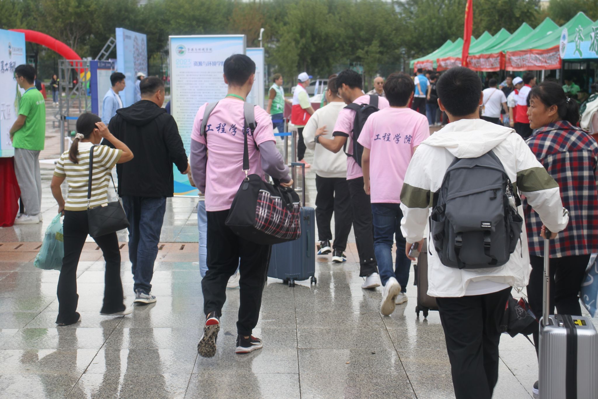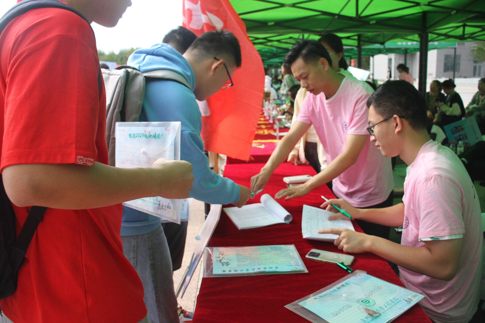 在迎新站点,我们设置了六个独立通道,根据你们所属的班级进行分类。学院还为每位新生精心准备了一份爱心礼品,内有文具袋、六瓣院徽的钥匙扣,致新生的一封信、写给自己未来的信、标有班级姓名的胸牌。六瓣院徽分别分发给6位新生,同学们可以寻找伙伴将钥匙扣合成整体院徽,这份小礼物也象征着工程学子的团结协作,有助于同学之间相互交流增进感情,共同铸就工程向心力、凝聚力。接下来,同学们可前往2023级入学纪念墙签下自己的名字,并在“工程一家人”处和家人拍照留下美好瞬间。志愿者们热情相助,帮助新生拎行李,引导他们并送达宿舍,确保每位新生都能收到独一无二的入学礼物和最细致、热情的志愿服务。充分展现了学院领导和老师对每位新同学的欢迎和重视。