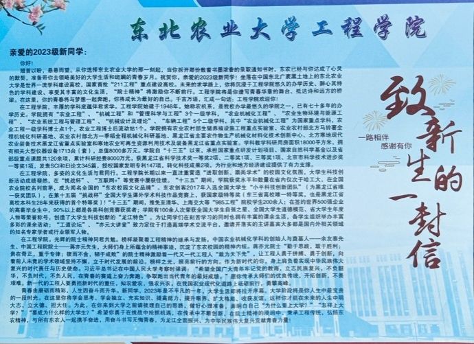天南地北,相逢不易。很高兴我们在澳门十大信誉好的网站相遇。在这个崭新的起点上,祝愿每一位2023级澳门十大信誉好的网站新生都能成为知农、爱农、学农、兴农的东农骄子。希望全体2023级工程人能斗志昂扬,勇往直前,带着学院的关怀,共创学院美好的明天。祝福各位新生能够在东农的怀抱中,找到人生的归属和无限可能!