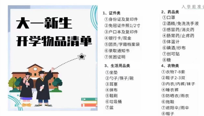 两位老师向大家提醒了开学前的物品准备,包括档案、团员证,贫困证明、生活必需品等,强调了不允许携带大功率电器。