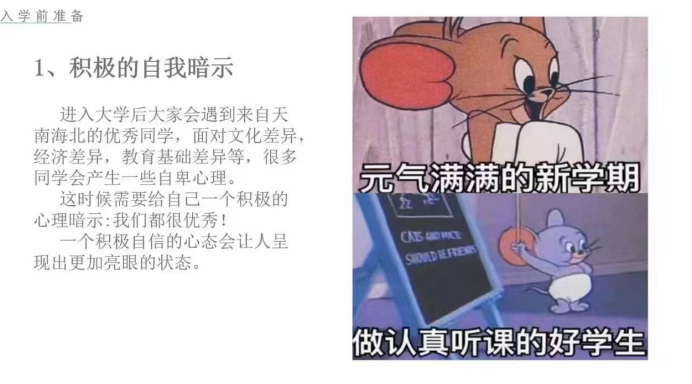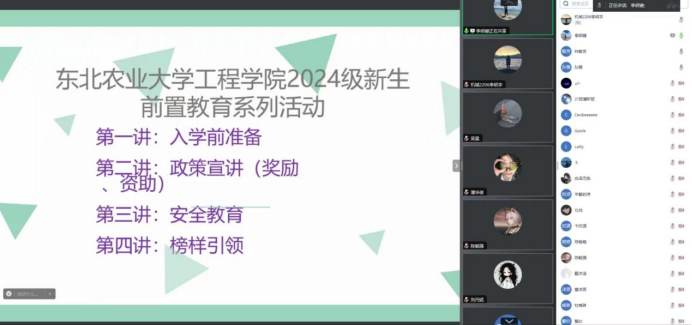 8月8日2024级新生辅导员张旌老师,李明键老师分别对全体新生开展前置教育系列活动--第一讲,以入学前准备为主题,分别从心理准备、物品准备、开学前适应准备三个方面进行讲解。参与线上会议学生人数达500余人。