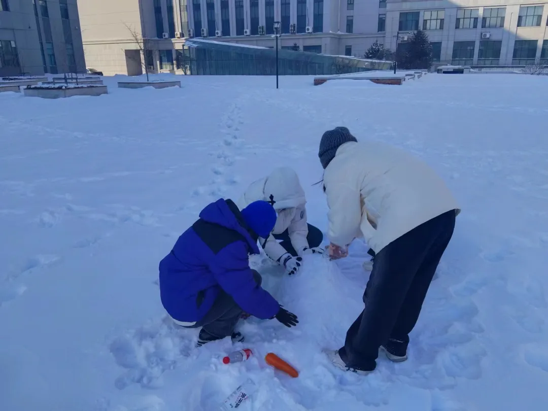 在一片银装素裹的雪地上,同学们欢声笑语,热情洋溢。他们手中拿着各种工具,有的挥舞着铲子,有的拿着扫帚,有的捧着雪球,共同创造着一个美丽的雪人。